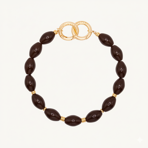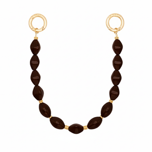Bracelet with Colorful Resin Stones and Gold Rings The PETIT RITA bracelet is made of light brown colorful resin stones, with small golden beads. Thanks to the two rotating loops, it can be easily attached to all our cases. The bracelet measures 28 cm in length (including loops). The bracelet comes in a small cotton pouch. |