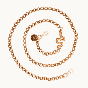CHAÎNE DORÉE AVEC PENDENTIF SERPENT ET 2 ANNEAUX DORÉS La chaîne DALIA se distingue par son pendentif animal, accompagnée du médaillon signature Louvini. Grâce aux 2 mousquetons tournants, elle peut être fixée facilement à toutes nos coques. La chaine présente une longueur de 124 cm (mousquetons inclus) et peut être portée en bandoulière ou en collier. Chaque chaîne est emballée dans un pochon en coton, avec une étiquette code EAN. |