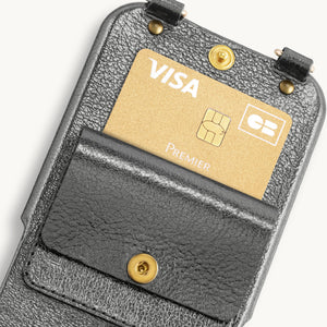 Etui en cuir noir pour téléphone portable avec pochette et des attaches métalliques dorées pour attacher une bandoulièreDétails