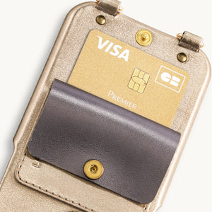 Etui en cuir anthracite métallique pour téléphone portable avec pochette et des attaches métalliques dorées pour attacher une bandoulièreDétails